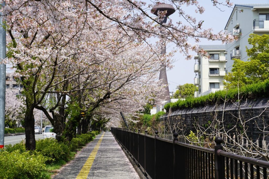 绵延 1.5 公里的笔直大道「健军自卫队通」,是前往熊本市的重要通勤路线之一。道路两旁种植了约 400 株的染井吉野樱,每年樱花季最接近满开的星期日,这里将从浪漫的樱花大道,转变成热闹的樱花祭典「健军自卫队通り桜まつり」!
