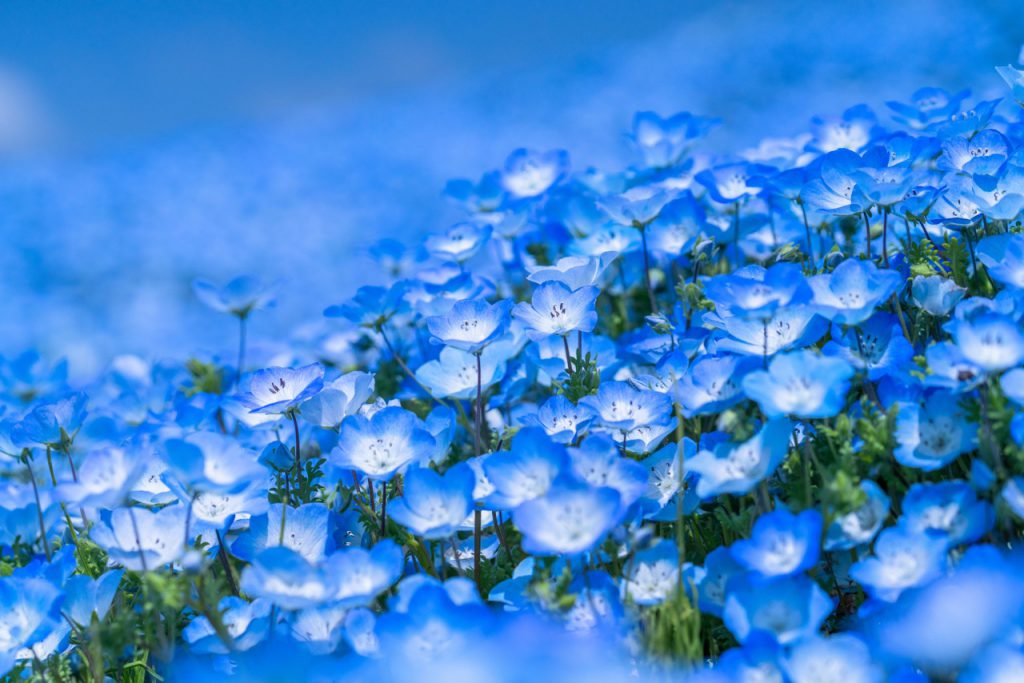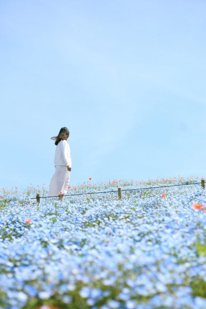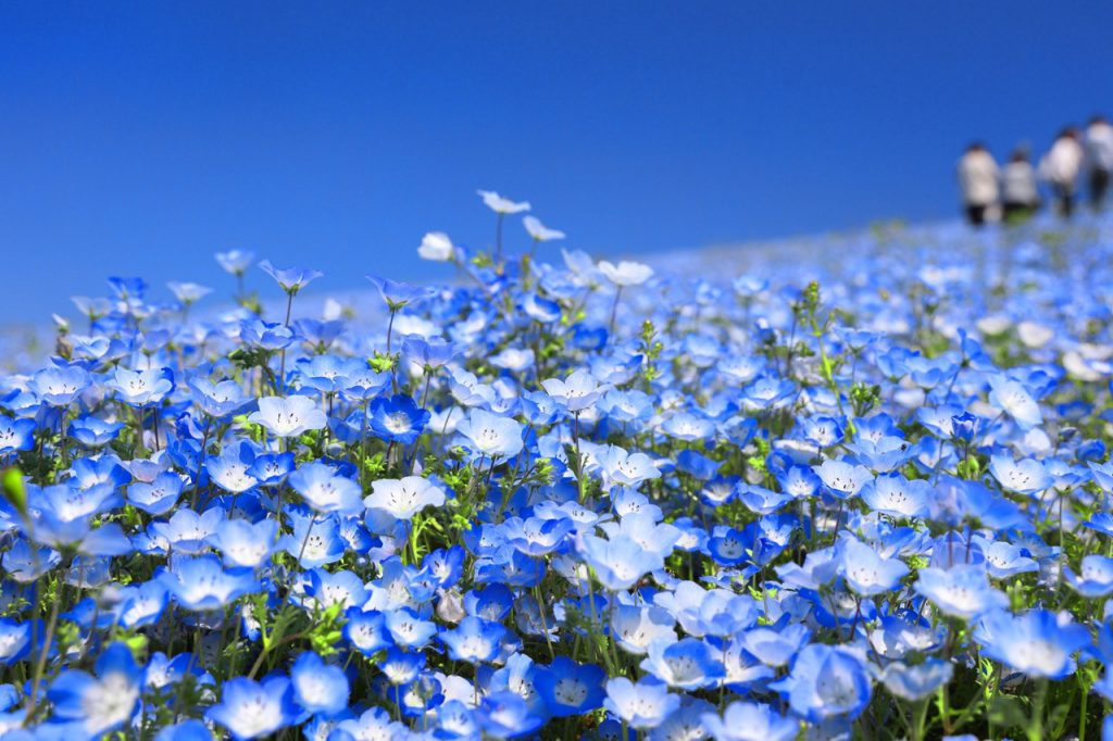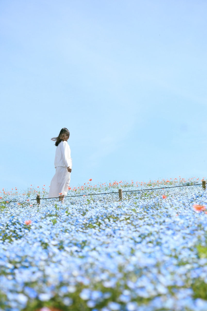 花朵盛开时,整片丘陵被淡蓝色花朵覆盖,彷佛与天空和太平洋相连,壮观又梦幻。粉蝶花花朵小巧可爱,微风吹过时,整片花海化作蓝色波浪,在丘陵上轻轻摇曳,是日本春季最具代表性的花海绝景之一,也是春天一定要看一次的日本风景。