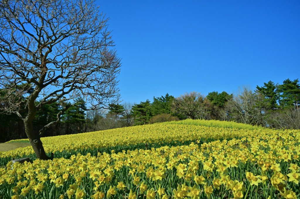 春季花卉接力从水仙(スイセン)揭开序幕。松林间盛开的白色与黄色水仙沿着步道绵延绽放,在微风中轻轻摇曳,是园区早春最清新优雅的景色之一。