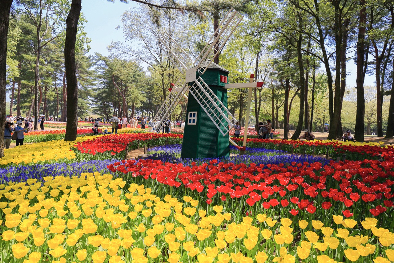 林间透出的阳光,让色彩缤纷的郁金香(チューリップ)更加浪漫,不同颜色的花朵让花田宛如拼布,充满童话色彩的梦幻景色,是春季非常受欢迎的拍照景点。