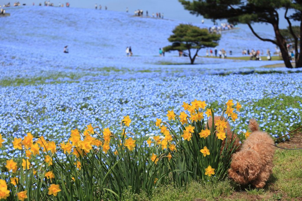 国营常陆海滨公园最具代表性的春季绝景,就是位于见晴之丘约 450 万株粉蝶花(ネモフィラ)所形成的梦幻蓝色花海,每年 4 月中旬至 5 月上旬为最佳观赏期。
