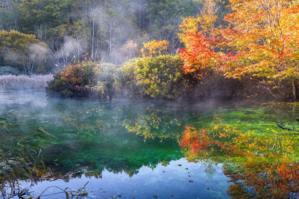 田代池的美景各个季节都不同,夏天的银杏梅花藻(イチョウバイカモ)、秋天的枫叶、还有冬天的雾凇,都是此生必看的绝美景象。