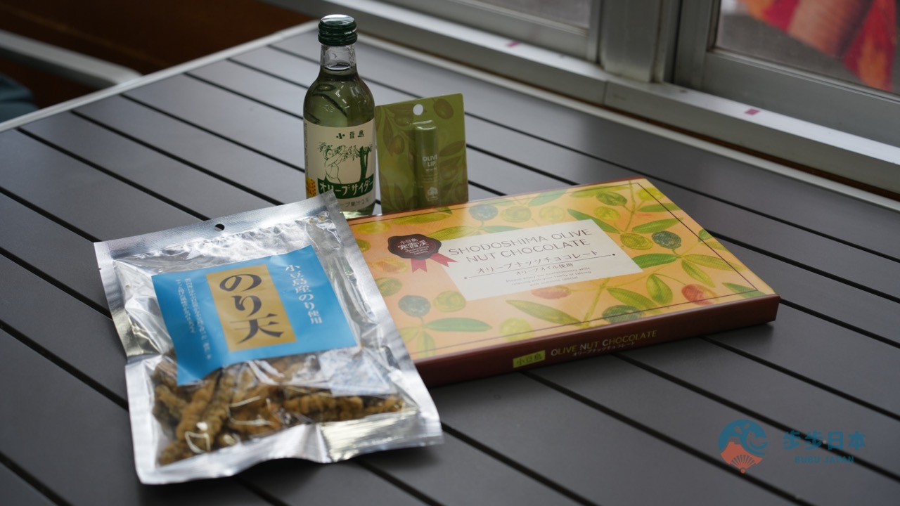 为了回应这份待客之道,加上对小豆岛食材的好奇心,还没玩透就先买了几样名产。跟友人一致爱上的,是使用了小豆岛产海苔制作的「海苔天妇罗饼干(のり天)」、小豆岛必喝的橄榄汽水、橄榄护唇膏,以及店家销售 No.1 的橄榄巧克力坚果。