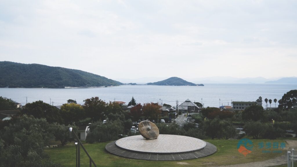 从橄榄公园往下眺望,可以见到广场上源自希腊,祈愿小豆岛和平的纪念碑。异国风情的装饰,不仅是因为地中海风情相似,而是小豆岛与希腊爱琴海的观光胜地米洛斯岛(Milos)为姐妹岛的象征喔。