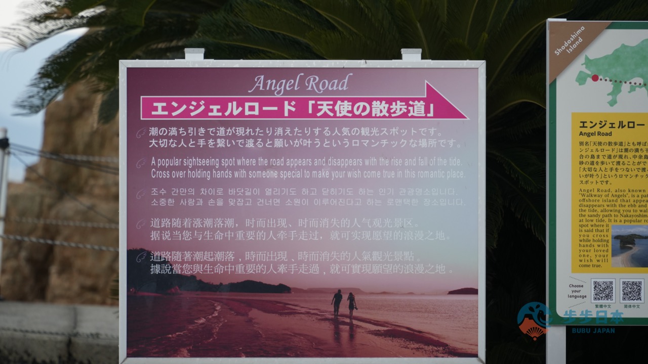 非常期待的「天使之路(天使の散歩道)」,当海水退潮时,会露出通往对面小岛的沙滩步道。据说只要和恋人手牵手走过,就能获得实现愿望的机会。