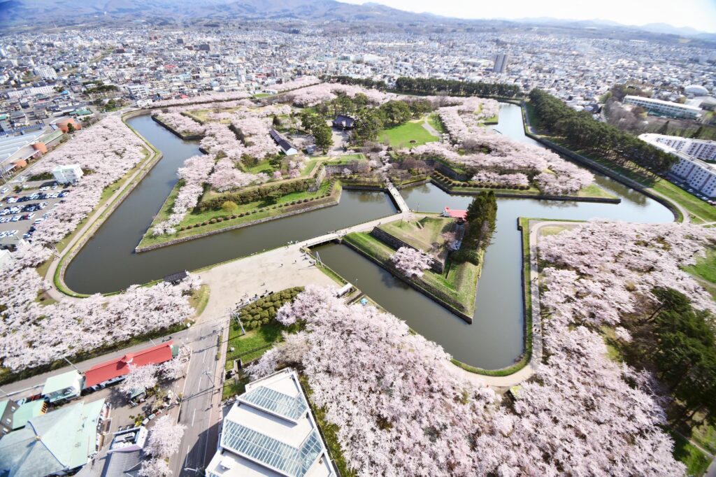 「五棱郭公园」是北海道最著名的赏樱景点,以染井吉野为主的 1,600 棵樱花树,在春日将五棱郭堡垒染成梦幻粉色花海。