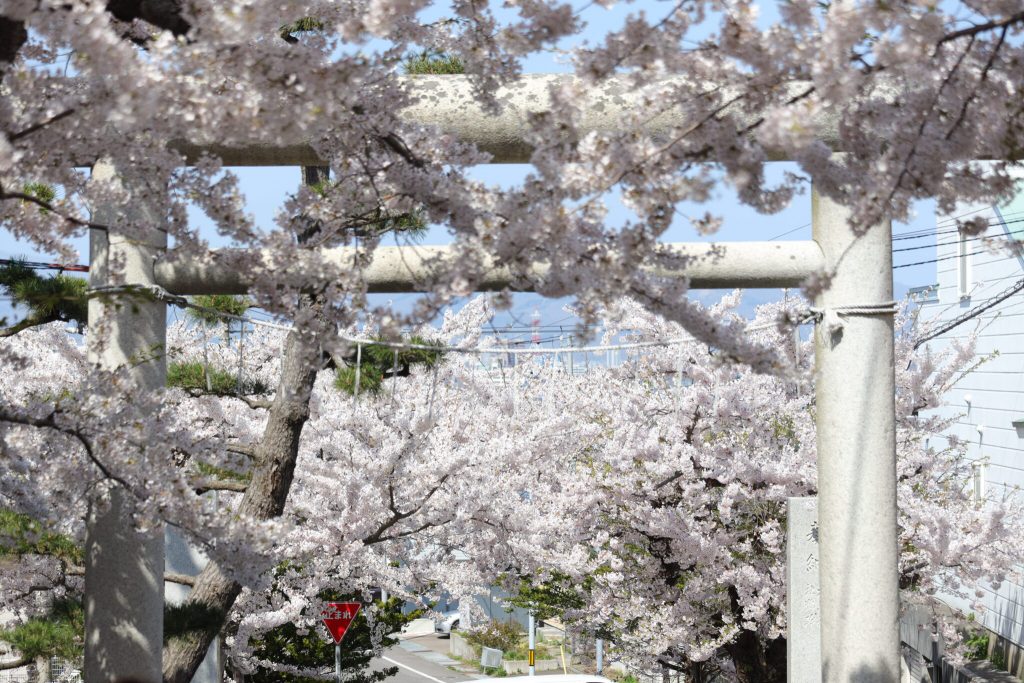 「石崎地主海神社」位于函馆郊区,以种植多达 180 棵的「八重樱」闻名。每到樱花季节,粉红色的八重樱会将神社参道至鸟居编织成一条长约 300 公尺的樱花隧道,从高处的鸟居往下俯瞰,樱花隧道直通蔚蓝的津轻海峡,是函馆的独特的樱花秘境。