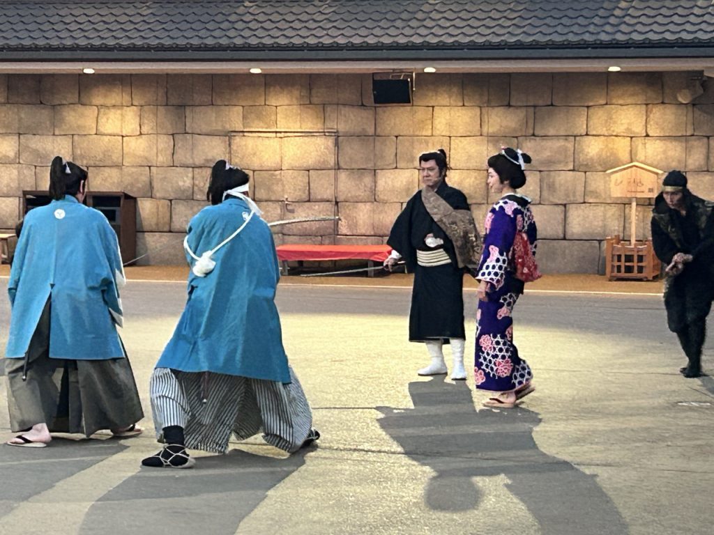 穿着当时服装的人们在路上来来往往。商人走过身旁,町女擦肩而过。理智上知道这是人造的。但打造这一切的,是一百年来让时代剧的世界成为「真实」的职人们,以及为这个世界注入生命的演员们。