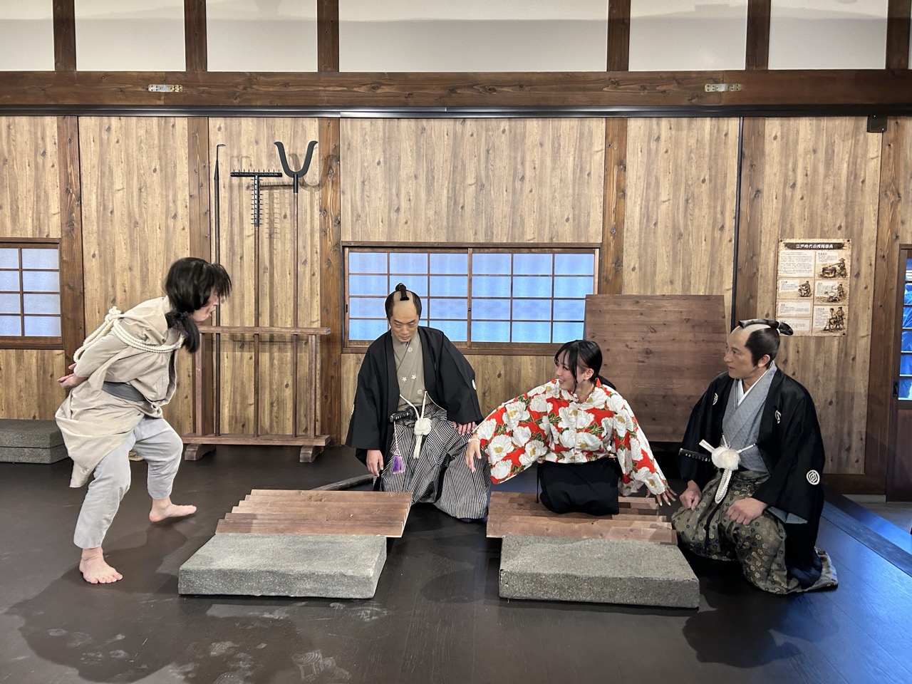 这是一个可以模拟体验江户时代拷问的内容,相当大胆的企划。摄影棚的美术工作人员重现的拷问器具一字排开,你可以实际体验被施以拷问,据说不会痛。