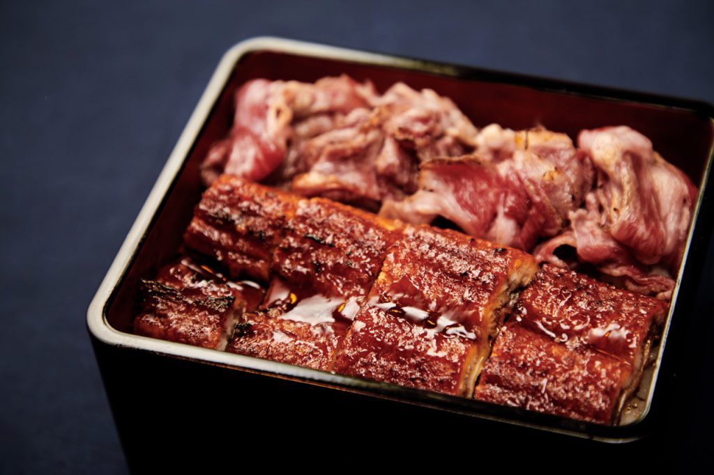 我吃的是「う乃屋」的牛肉和鳗鱼同时端上一膳的奢华料理。味道无可挑剔。