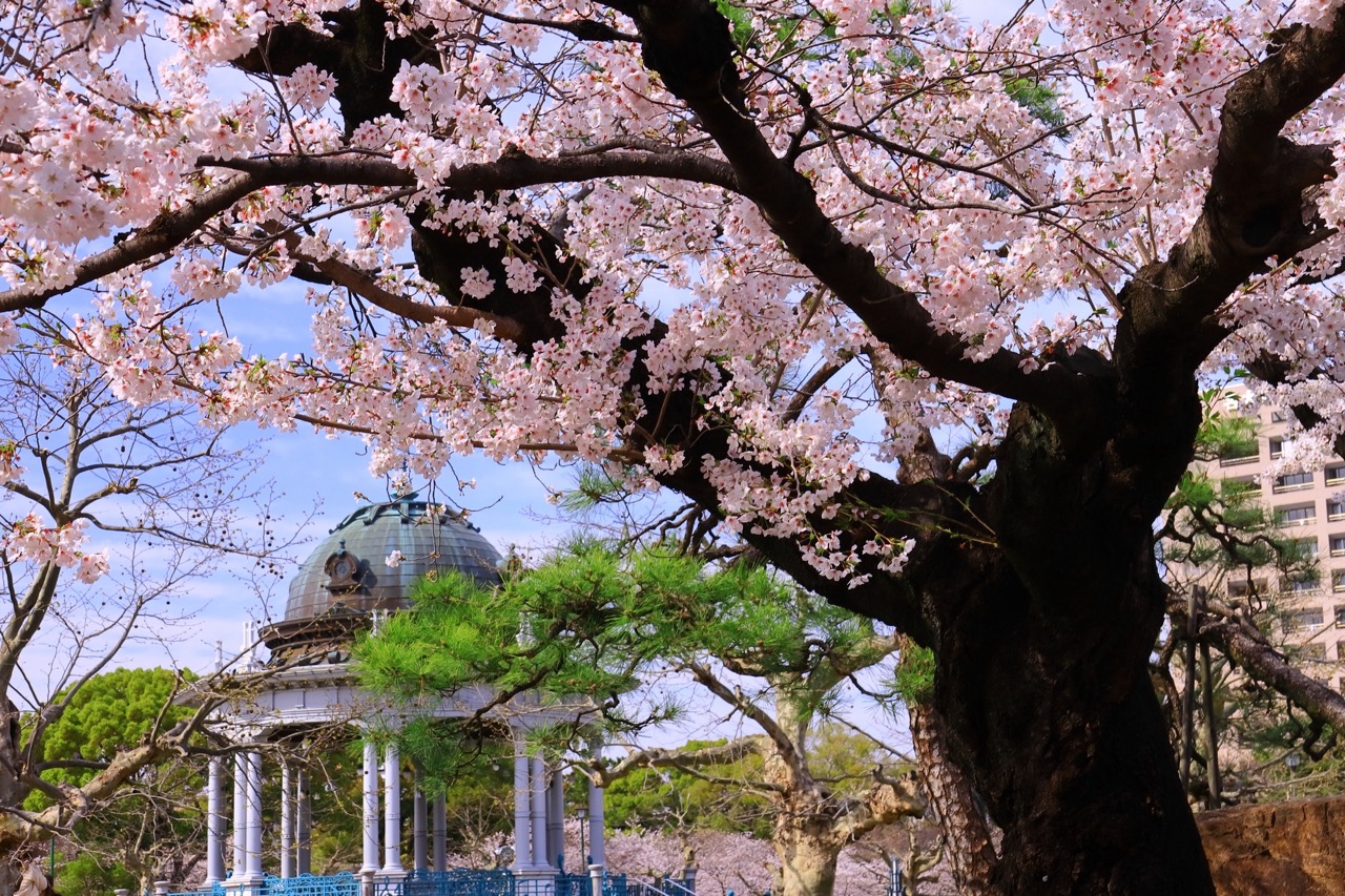 再往东走,圆形的音乐台(奏楽堂)安静地立在树影之间,文艺复兴风格,设计师为铃木祯次,手扶栏杆上刻着日本国歌的乐谱。台风曾令它倒塌,1997 年依原貌重建,春天的音乐会仍在此举行。