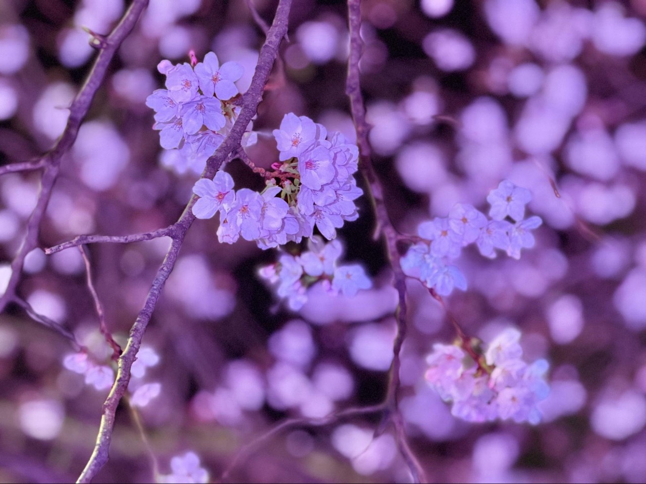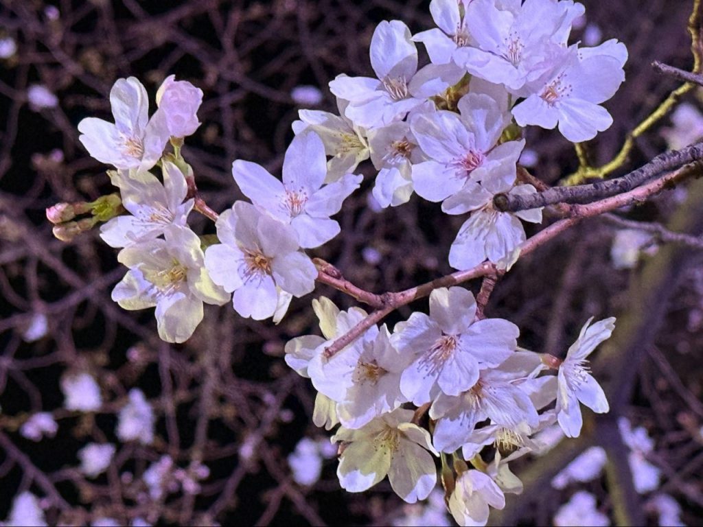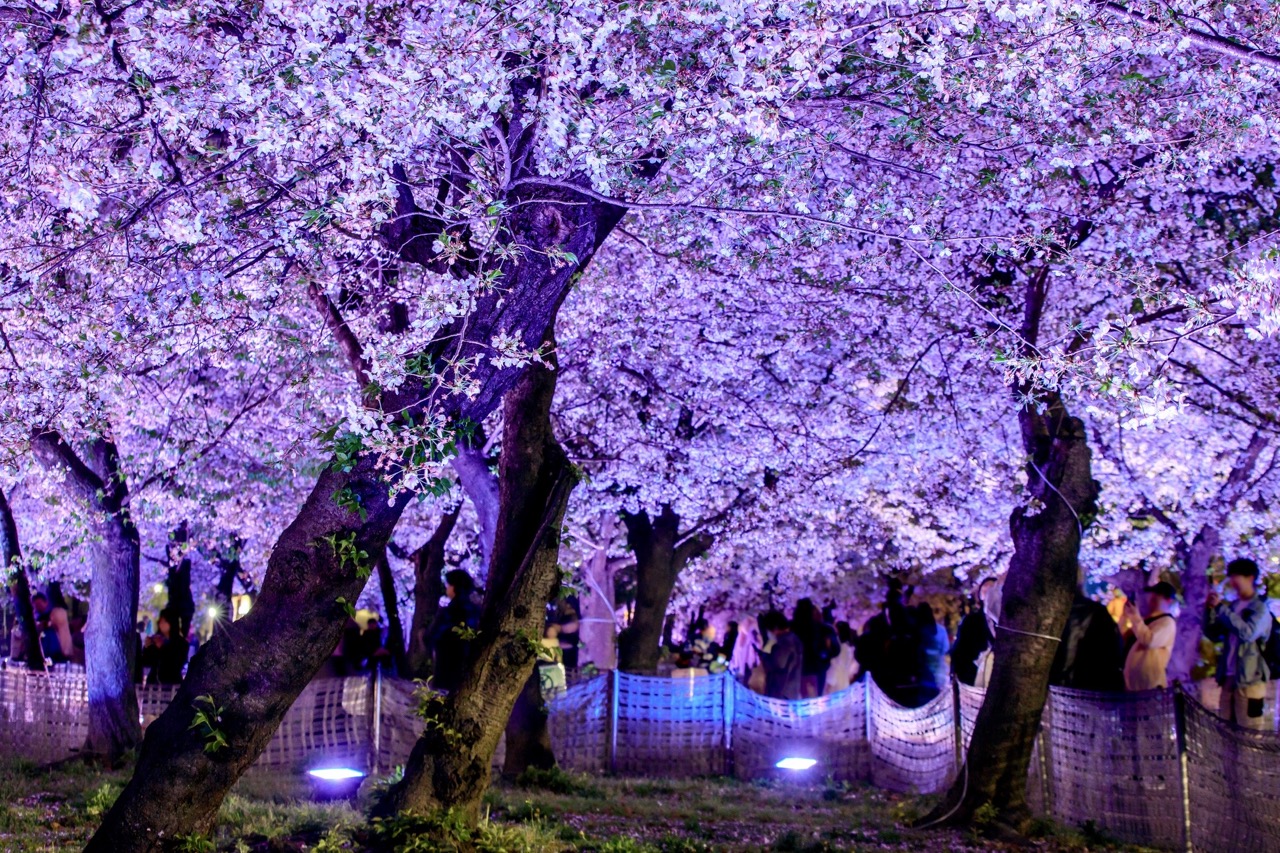 公司同事在花下喝起第一轮啤酒,父母牵着学步的孩子在树下徘徊,学生围成一圈传递着便利商店的食物,也有人独自落座,静静看着四周流动的人群。灯亮之后,夜樱的光将花色压得更深,而人群仍未散去。