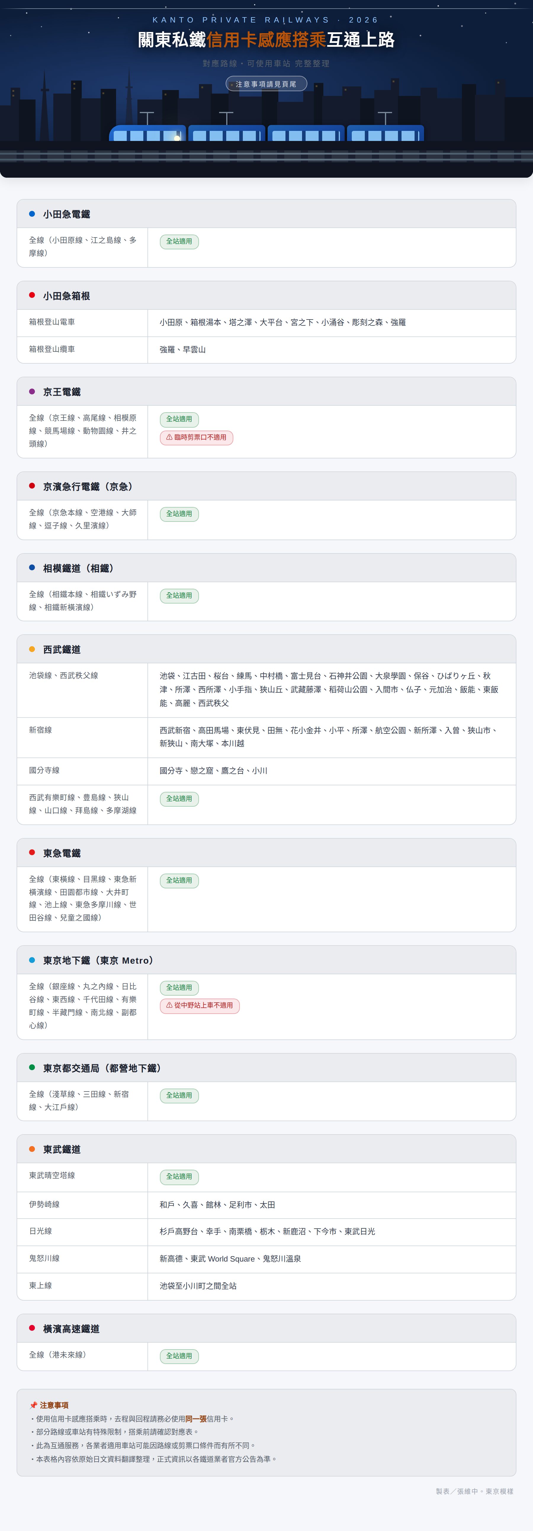 此次制度最大亮点,在于打破过去各公司各自运作的限制,首次实现跨公司、跨路线的连续使用。过去即使是直通运转的路线,感应支付多半仅限单一公司区间使用,如今则可一刷到底。例如从西武线所泽站搭乘至港未来线元町・中华街站,或从东京Metro千代田线大手町站一路转乘至箱根登山电车箱根汤本站,皆可使用同一张信用卡完成整段旅程,便利性逐渐接近交通IC卡PASMO的使用体验。
