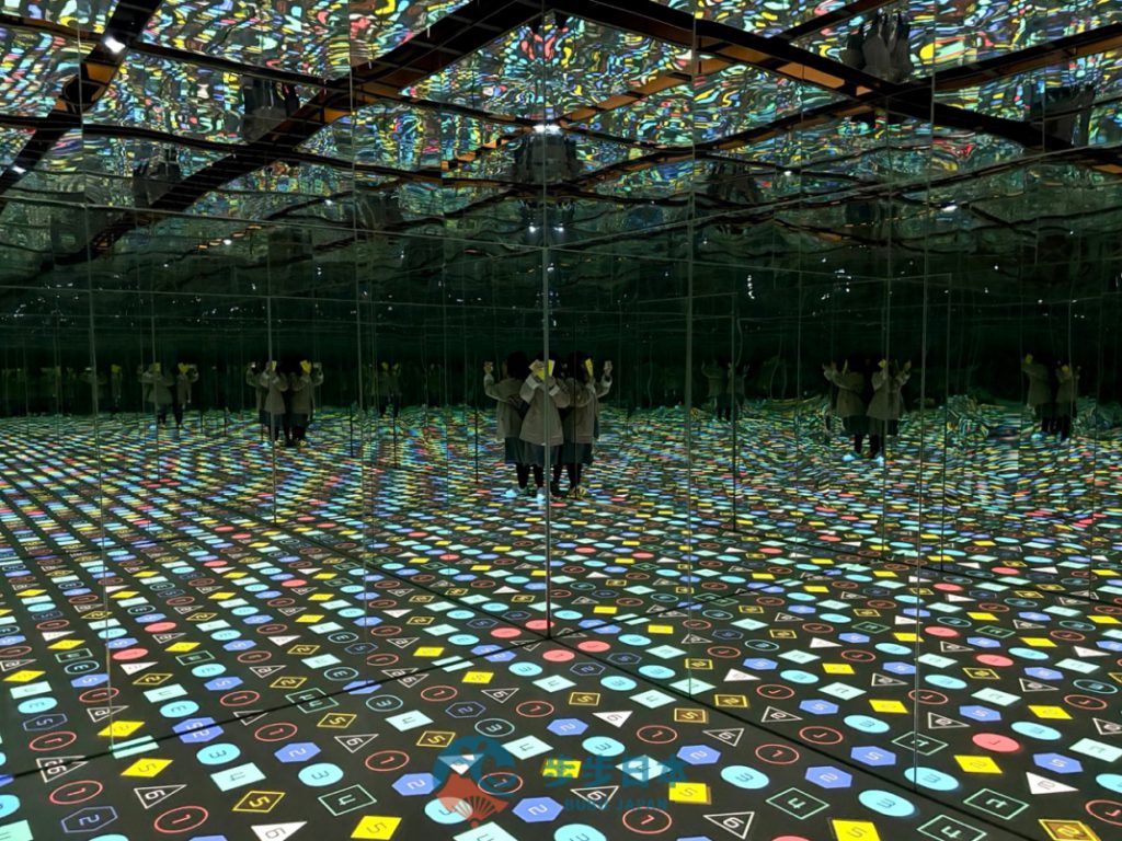 接着进入「无限电梯 BOX」的空间。这座利用全镜面打造的沉浸式设施,透过迷幻的声光特效,将狭小的电梯间拉成无边无际的魔幻维度。