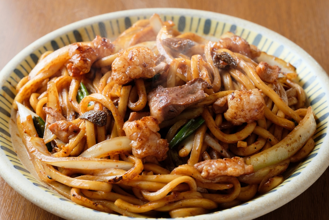 津山地区的代表性美食「内脏炒乌龙面」,以新鲜牛内脏搭配乌龙面快炒而成,口感Q弹且带有浓厚酱香。