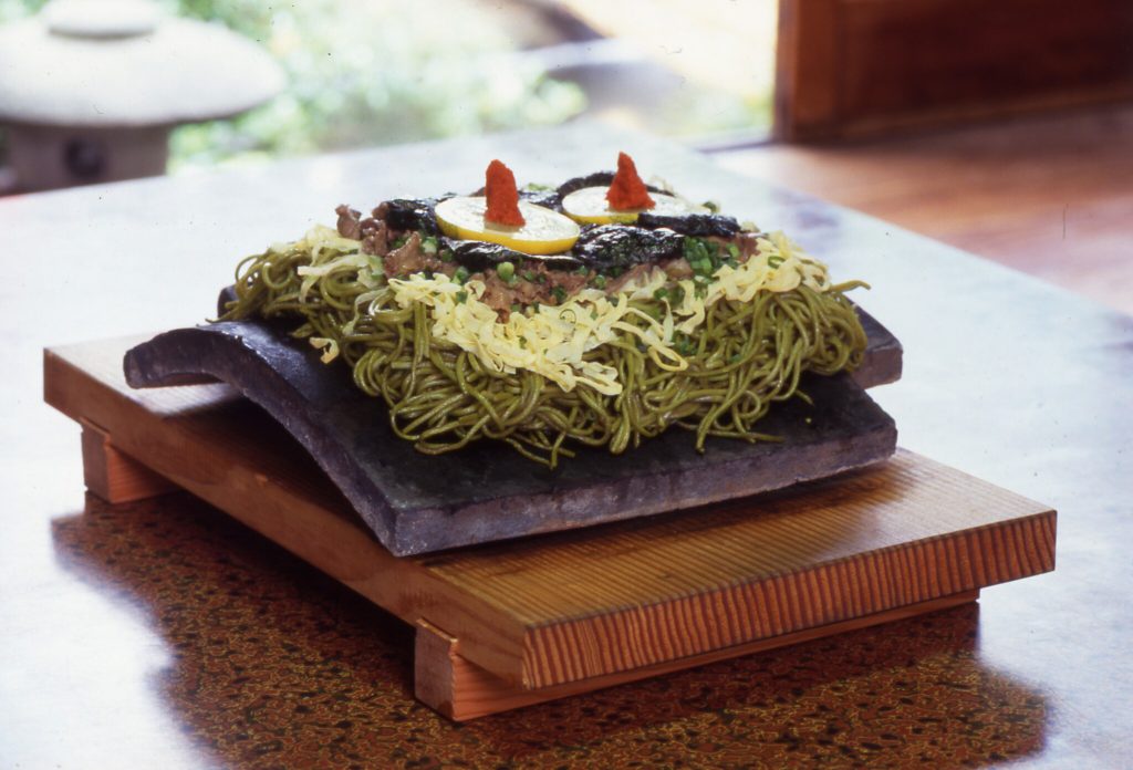 料理将特制瓦片加热后,放上抹茶荞麦面,再搭配牛肉、蛋丝与海苔等配料,并佐以温热沾酱与柠檬片食用。下层面条因接触瓦片而呈现酥脆口感,上层则保持柔软弹牙,形成丰富层次。