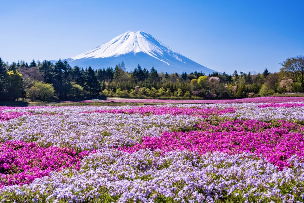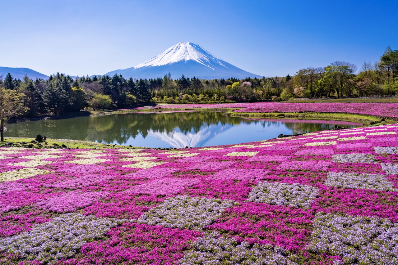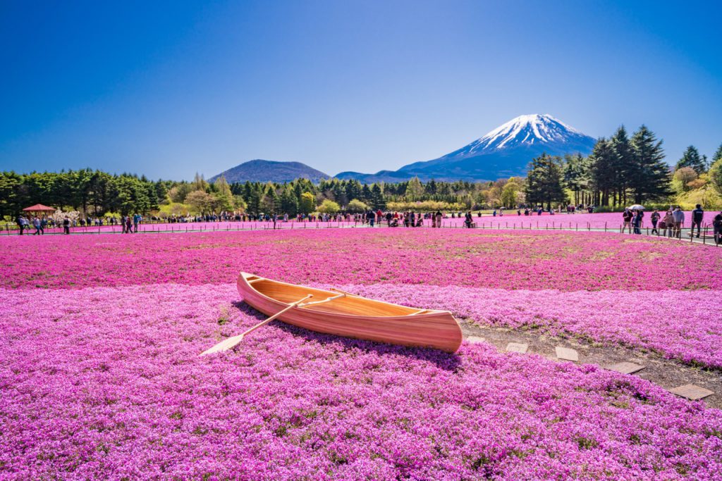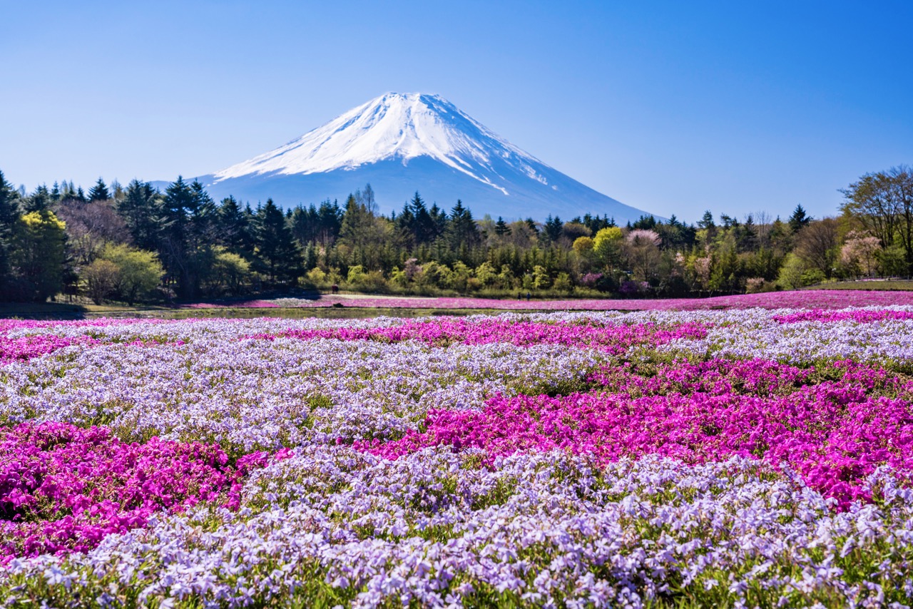铺满地面的芝樱,不像樱花在树上盛开,而是以低矮的姿态沿着地面延展,形成整片宛如绒毯的粉色花海。当视线越过这片花毯,远方是仍覆着残雪的富士山,蓝天、白雪与粉红花海,形成出极具层次的画面,也成为许多日本人心中日本春天的代表风景之一。