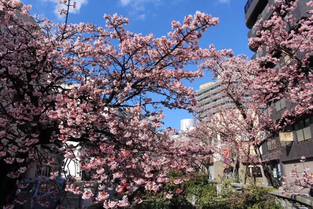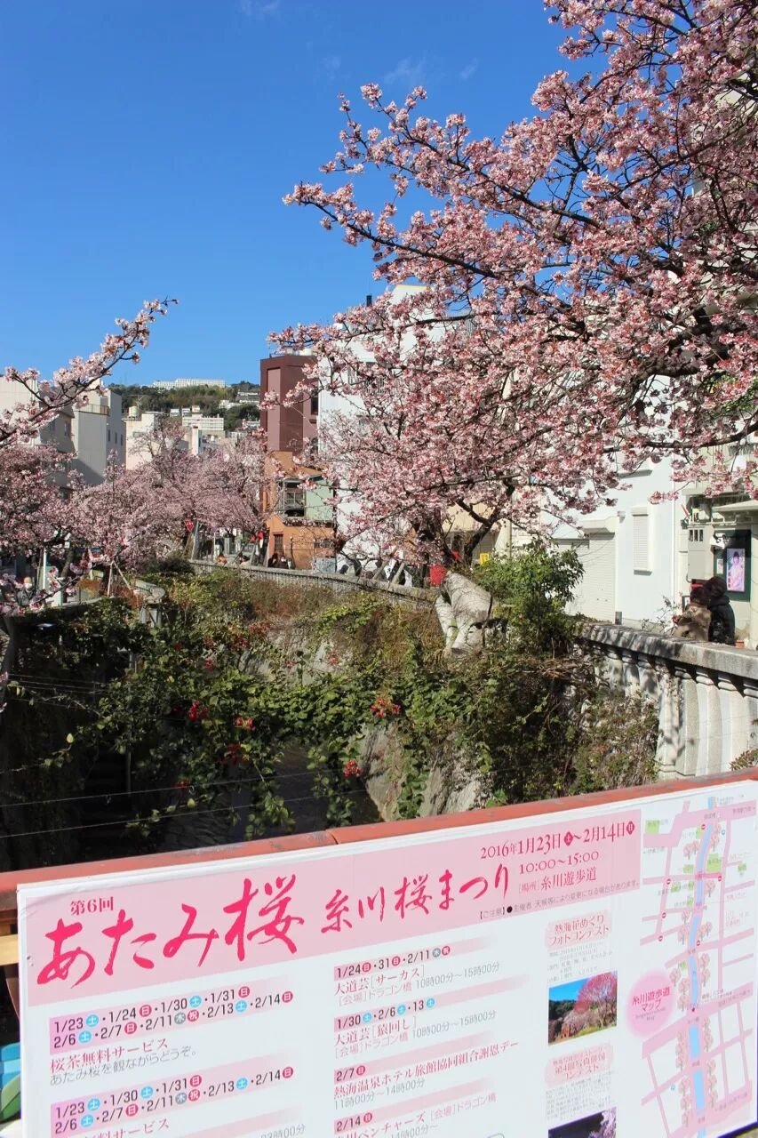 热海樱,樱花种类当中的「寒樱」品种,号称是全日本最早开的樱花。在靠近热海站商店街的「糸川游歩道」沿着小溪,有一条散步的樱花步道,这里的樱花树已经在一月底开花了。热海樱的花期久,大约到二月底、三月初仍会开花。花种比较接近在台湾会看到的樱花。