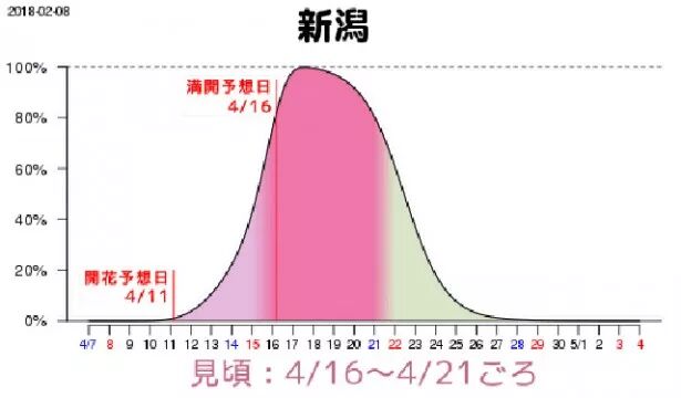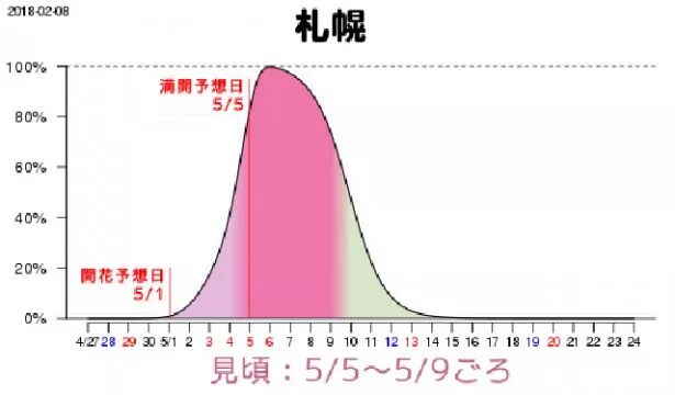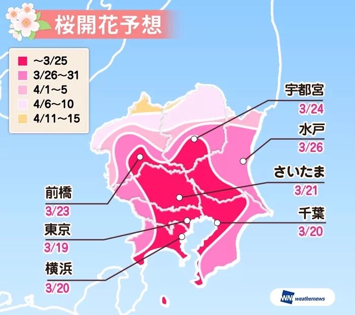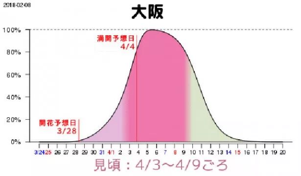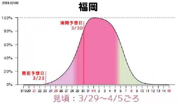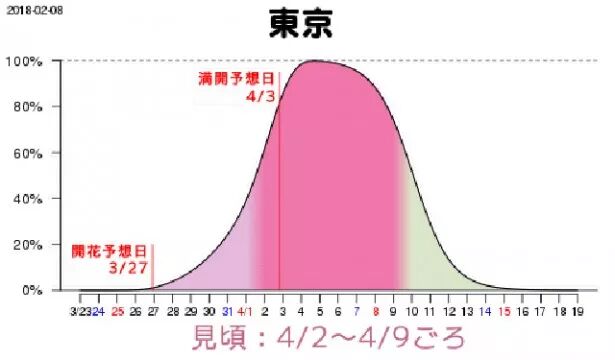 例如如图中色块,东京3/19为推算的「开花日」,而东京的粉红色色块标示到「~3/25」的话,3/25既是推算的满开日。