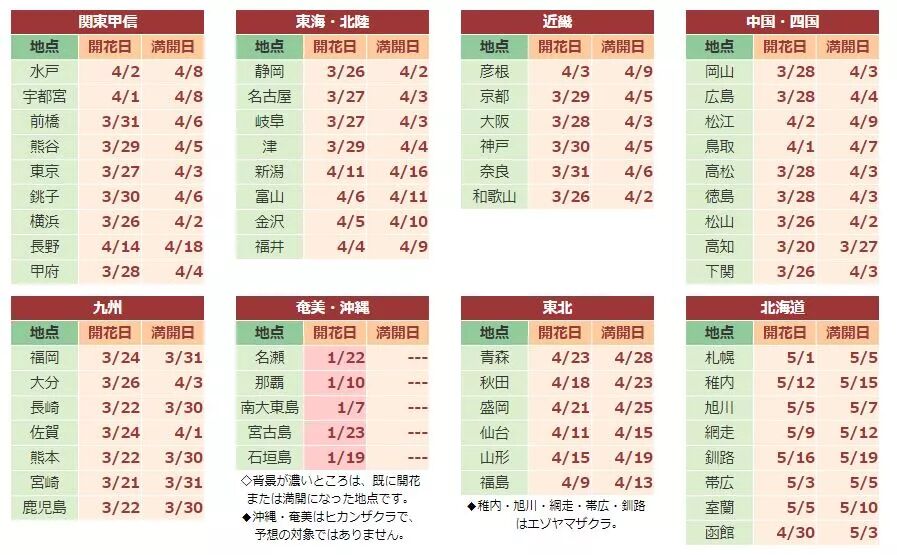 *提醒大家所谓「开花日」只是樱花花苞开始绽放,赏花的最佳时间,是在「开花日」后的5~7天左右,才为「满开日」。