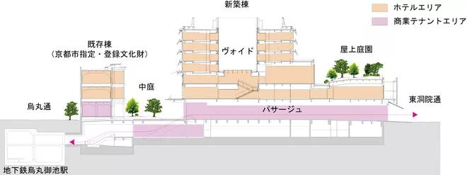 「ACE HOTEL KYOTO」是将京都市文化财的旧京都中央电话局加以活用,结合饭店与商业设施的复合开发企划中的饭店设施。面对乌丸通的既有建筑1楼将成为商业设施,2.3楼则做为饭店客房。紧邻着中庭旁边将有一栋地下2层地上7层的新建筑,地下1楼与地上1楼将是餐饮店及卖店空间,2到7楼则是ACE HOTEL。隈研吾建筑师担任该建物的外装设计,大量使用木质百页,将新建筑融入京都的街道景观。