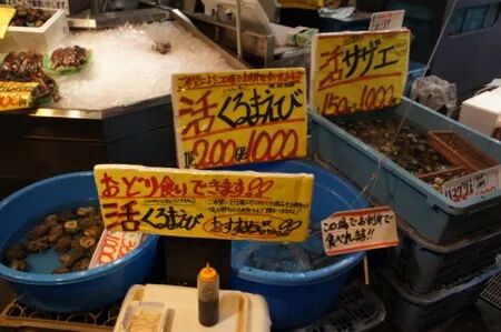 在市场里难得一见的「靴虾」(クツ海老)跟伊势海老,调理成口感鲜美且充满弹性的生鱼片。不经过任何调味加工的生鱼片,更加展现出Tore-tore市场里所贩售的食材,确实鲜美并具有口碑。