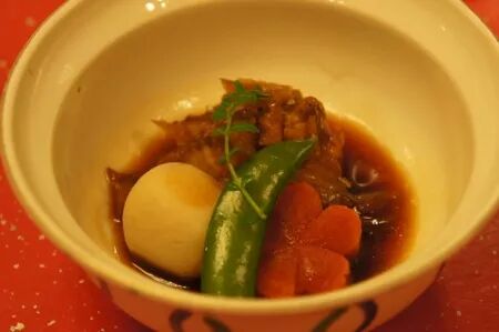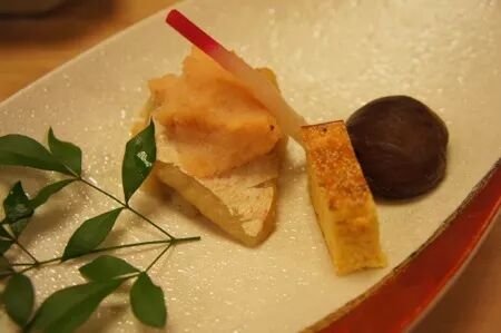 餐前酒相当特殊。是以云纹石斑的皮所浸制而成。日本酒的浓度很烈,不擅酒的我,刚入口时有点觉得太猛,不过慢慢喝下去后,似乎又比想像中来得顺口。