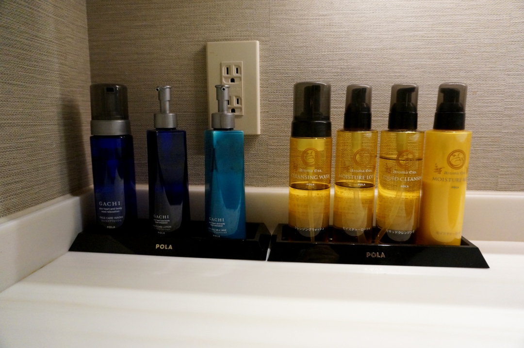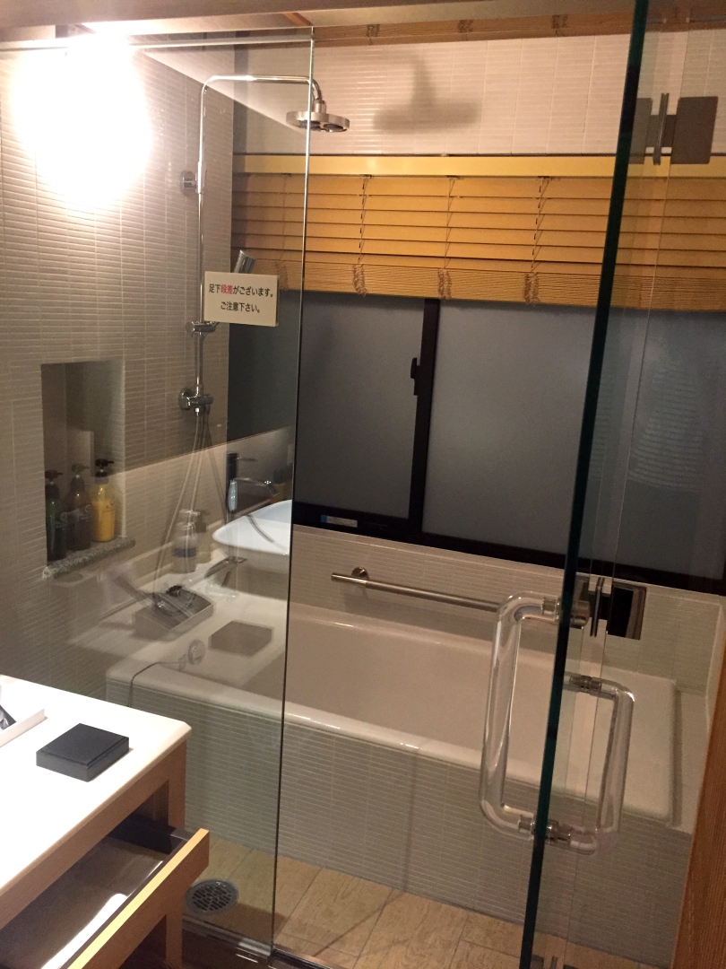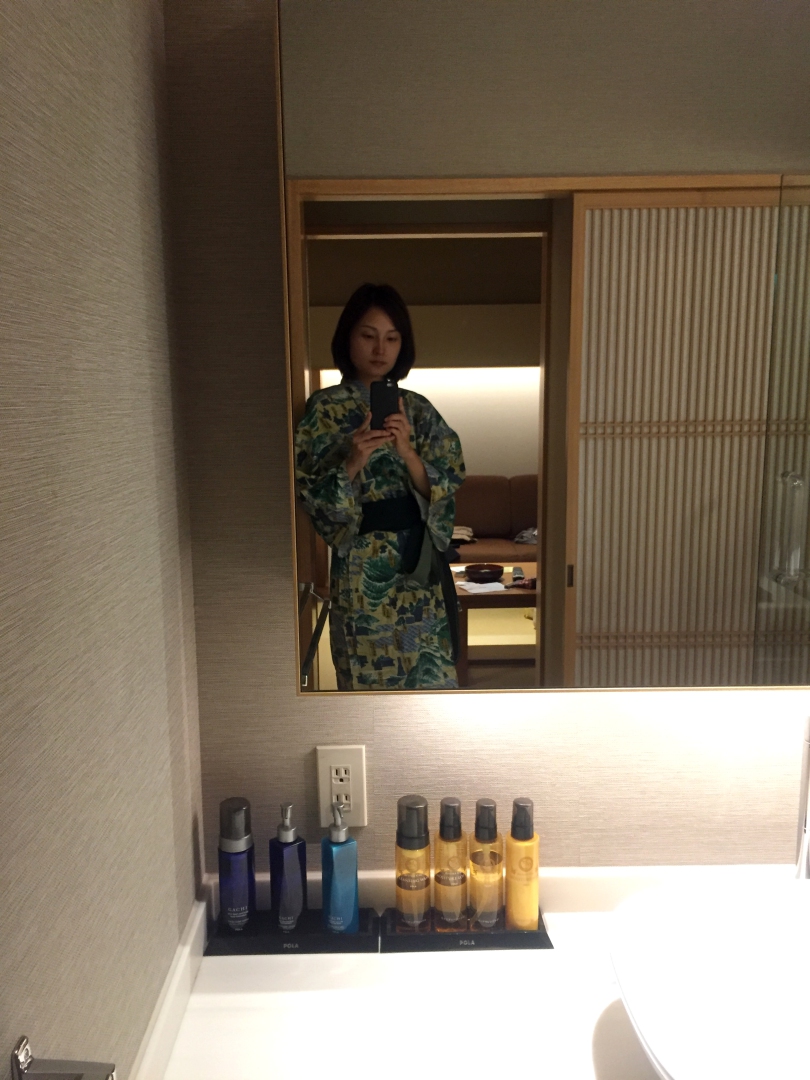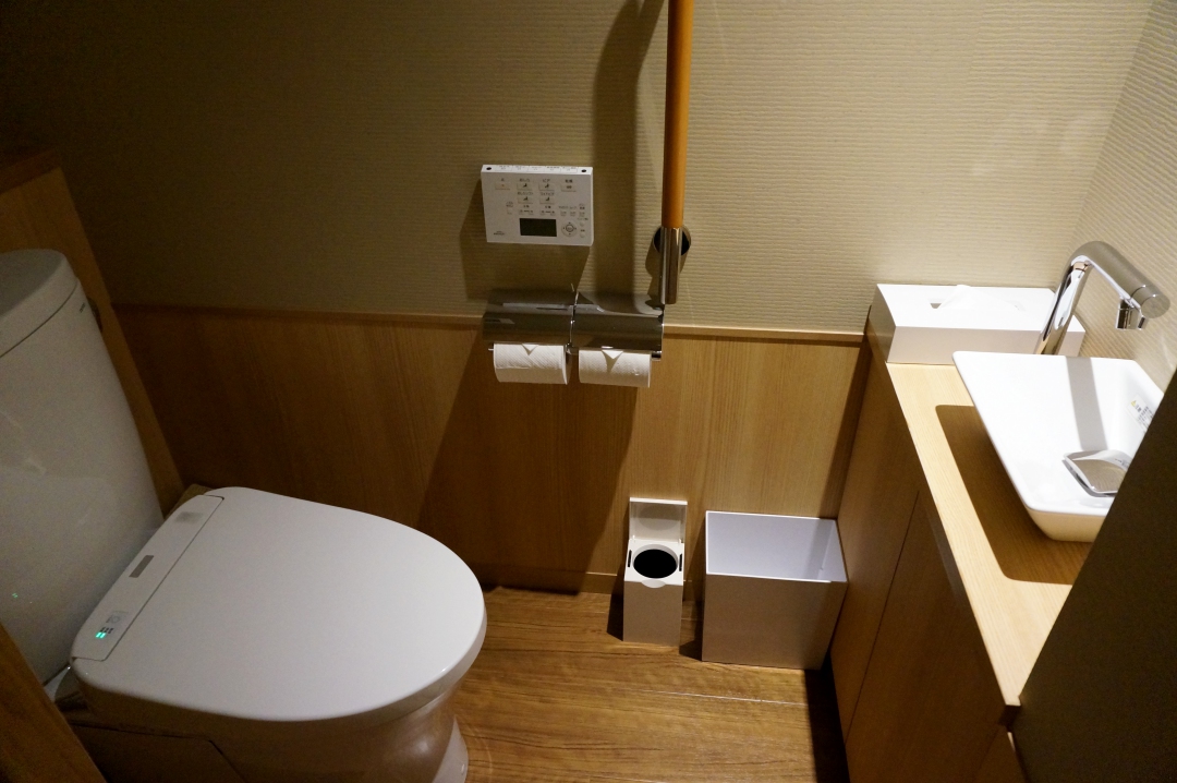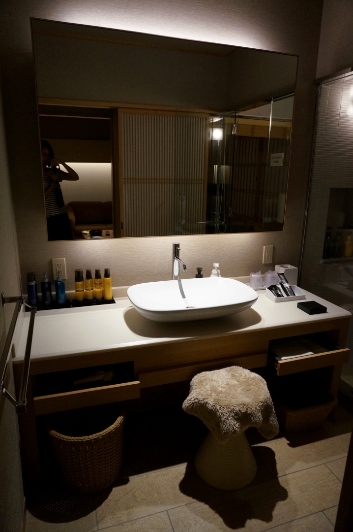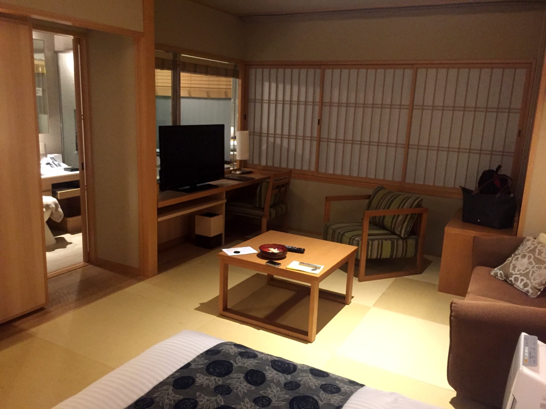 宽敞的榻榻米房里居然有床!对于睡不惯铺棉被在榻榻米上的人来说真是太贴心了。厕所是免治马桶。好大的梳妆镜与洗面台,然后旁边还有浴室。没看错吧?温泉旅馆的房间里居然有浴室?!这是第二个让我觉得贴心的点。女孩子一个月中总是有几天不方便的时候,虽然安排计画时会尽量避开,但总是会有万一。这时房间内有浴室就会安心许多。