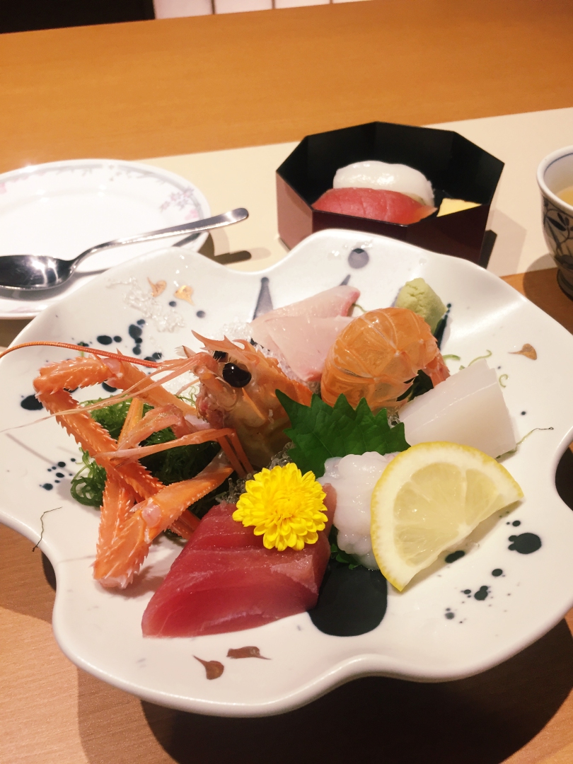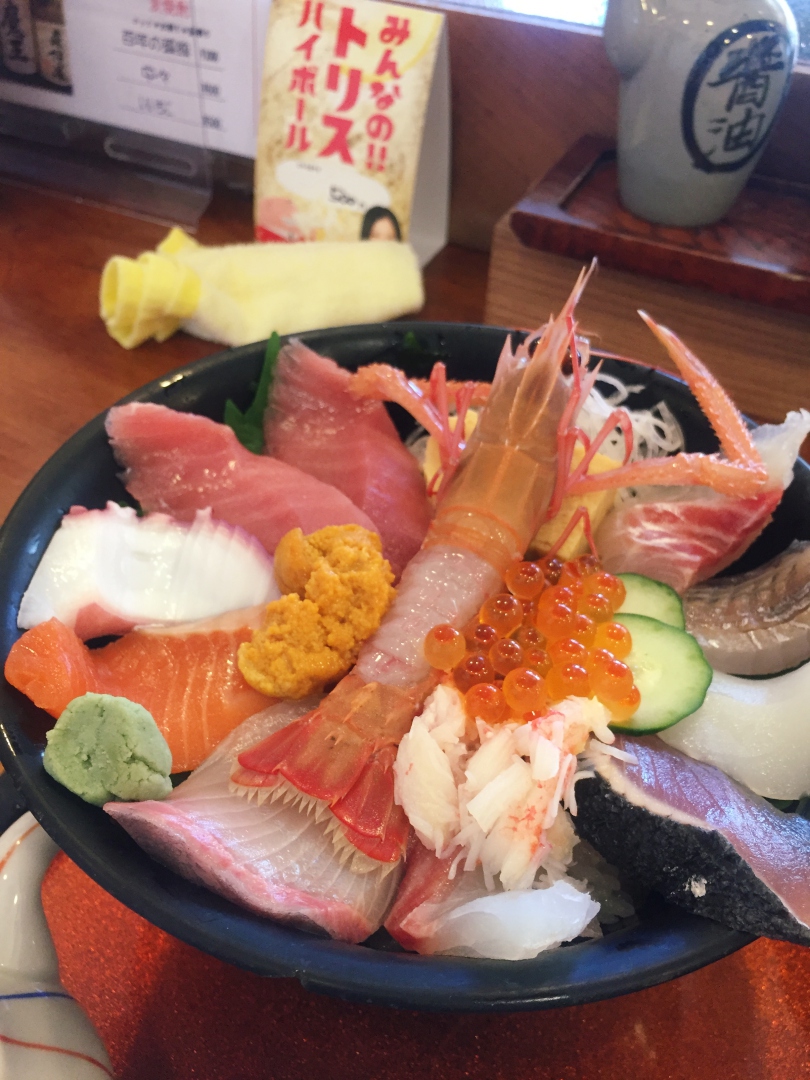 WOW!!有整只的虾、鲑鱼、鲑鱼卵、海胆、鲔鱼、鲷鱼、鲣鱼和章鱼等,各式各样的生鱼片,盖在热腾腾的白饭上,让我迫不及待马上开动!