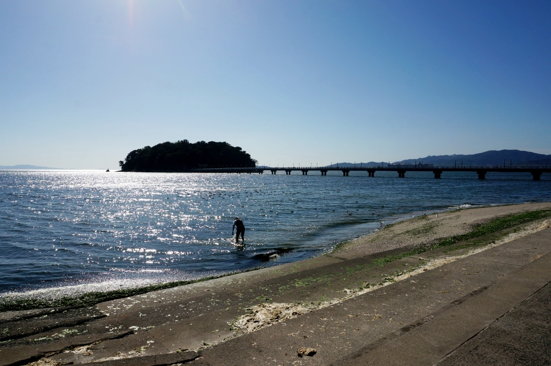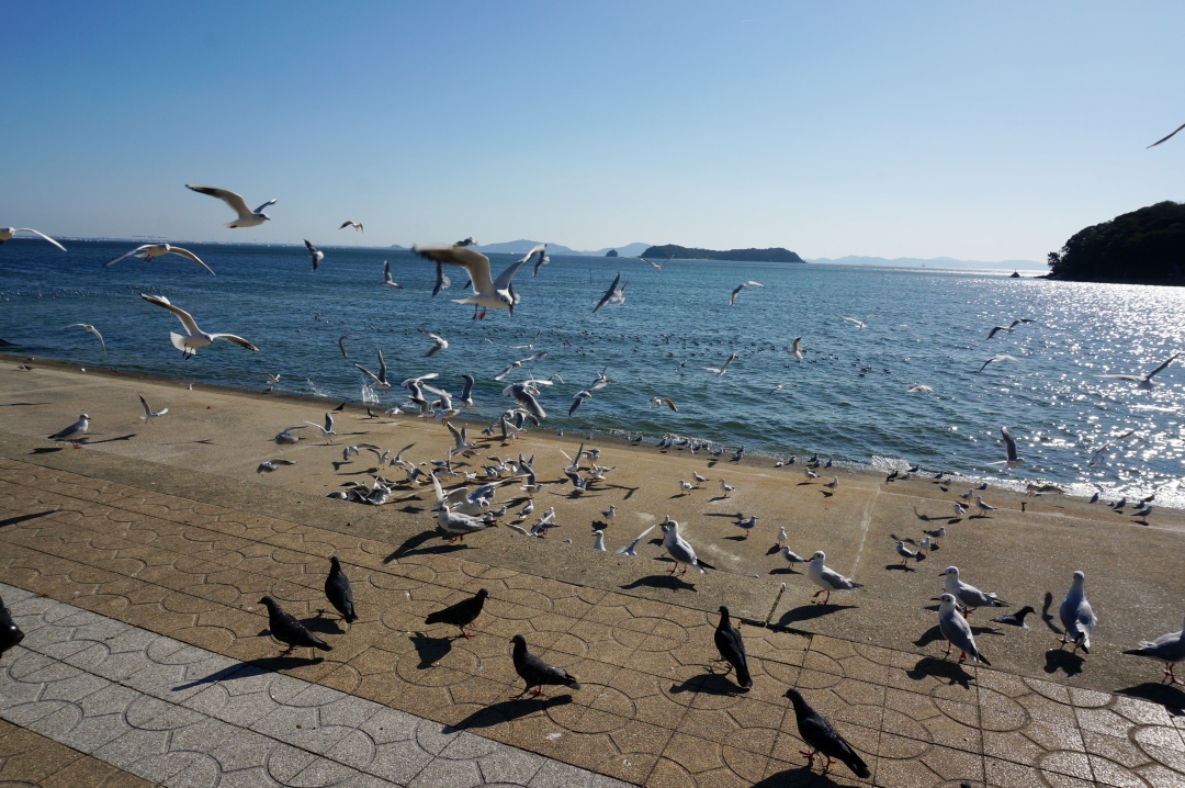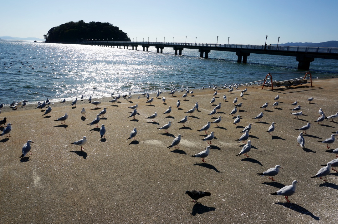 走去竹岛的路上有好多海鸥。刚好有人拿食物喂牠们,所以瞬间变成希区考克「鸟」的一幕。