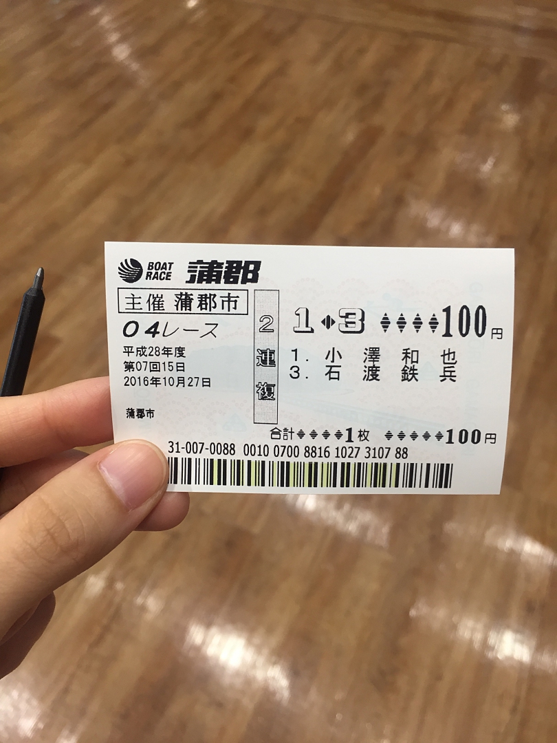 我投注「2连复」,3号艇跟1号艇,金额是100円。只要前2名是这2只赛艇,不需要照顺序都算中。