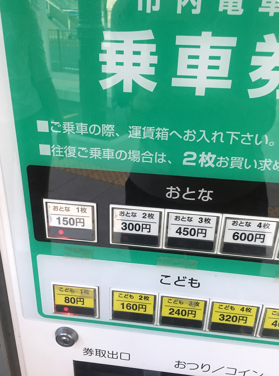 先来买车票吧。单程是150日元。要搭来回的话,记得回程的票也要一起买喔。如果你今天决定要搭路面电车一日游的话,也可以买一日券会比较划算。
