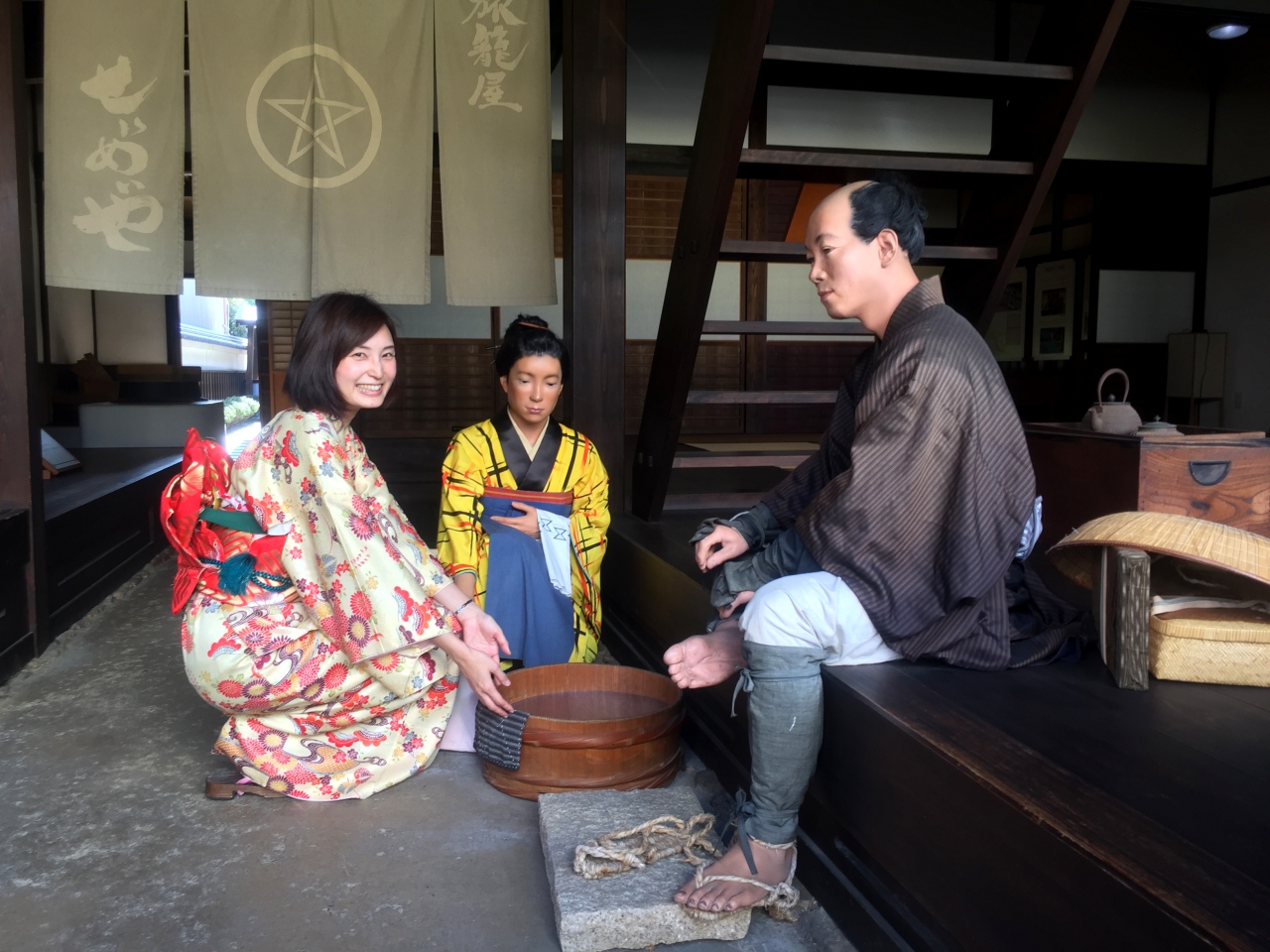 与当时的旅人蜡像合照,像不像走进时光隧道回到江户时代呢?