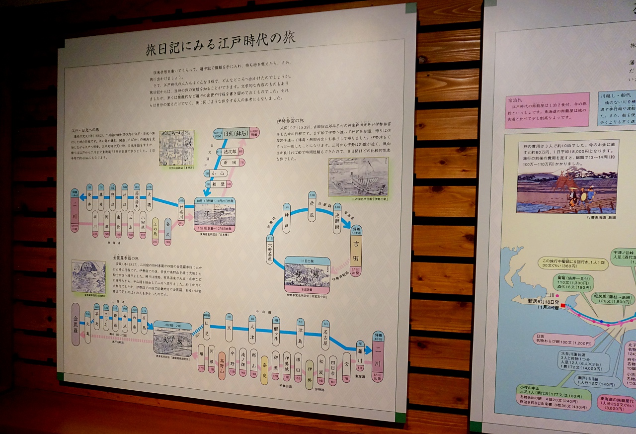 资料馆展示了以江户时代的街道及旅行为主题的东西。许多有关近代交通史,乡土历史的珍贵文献,旅人的蜡像,当时旅行所携带的道具等等。