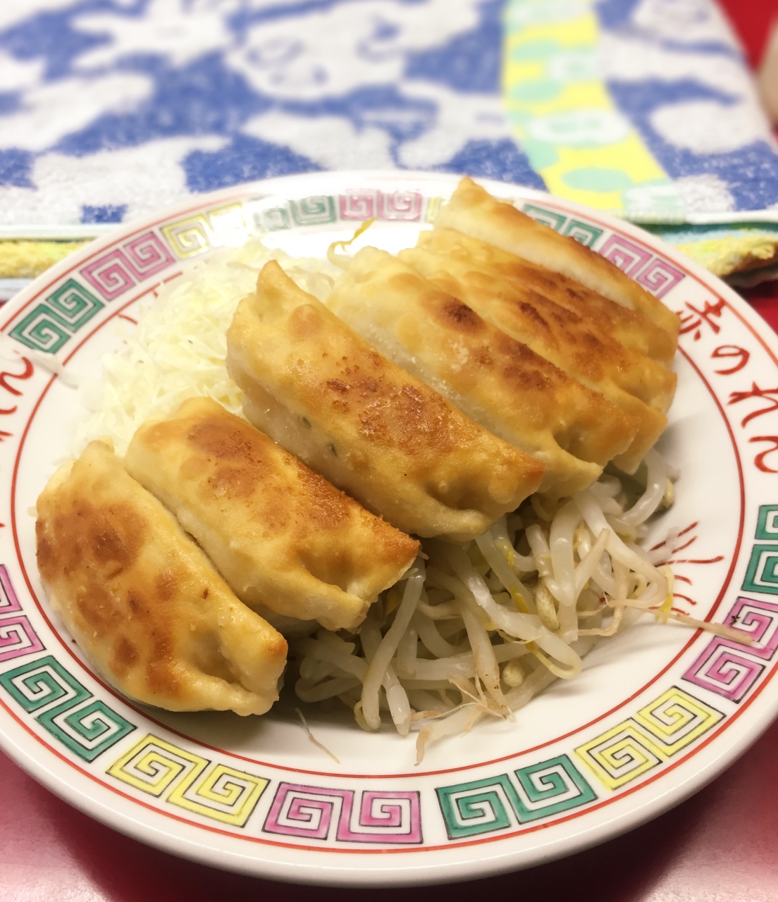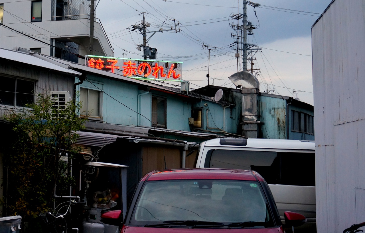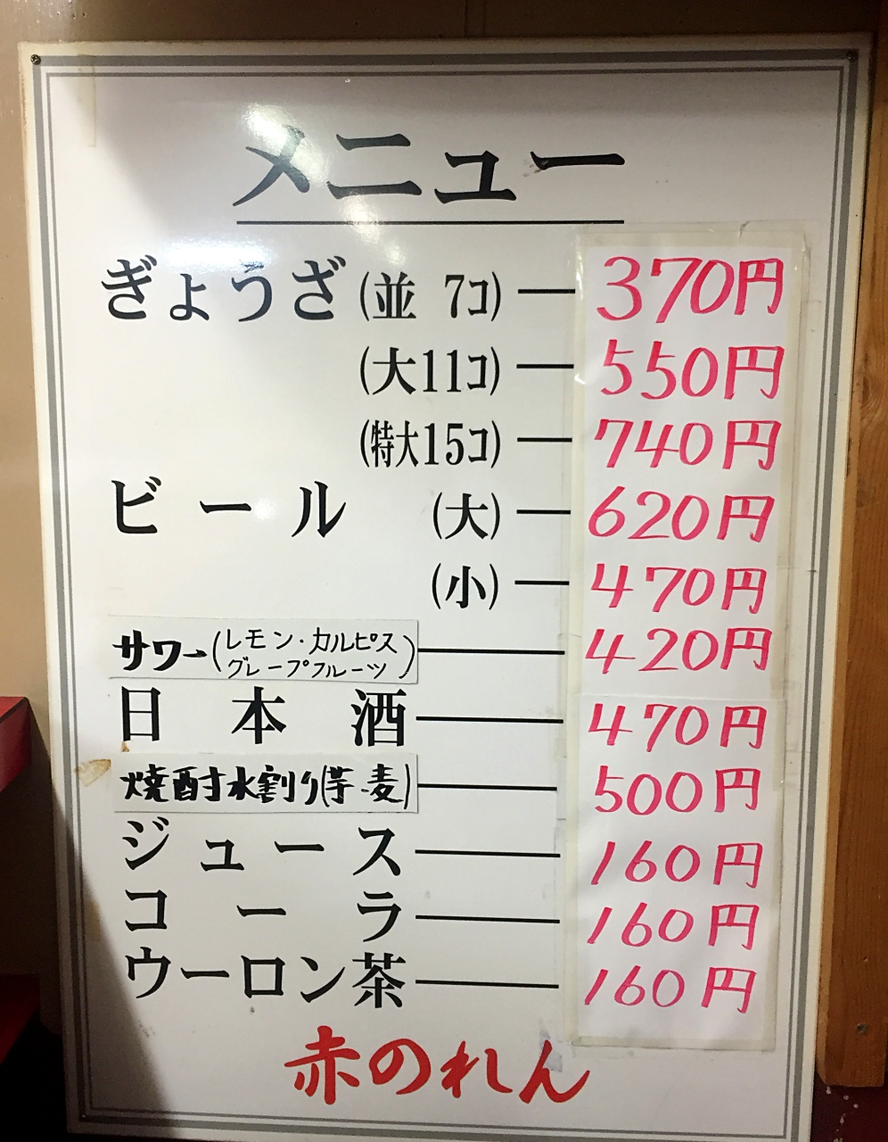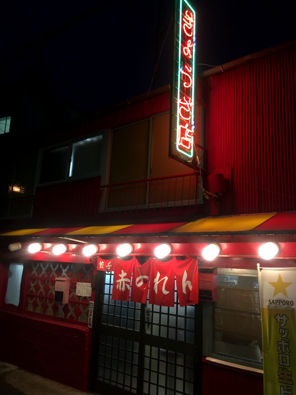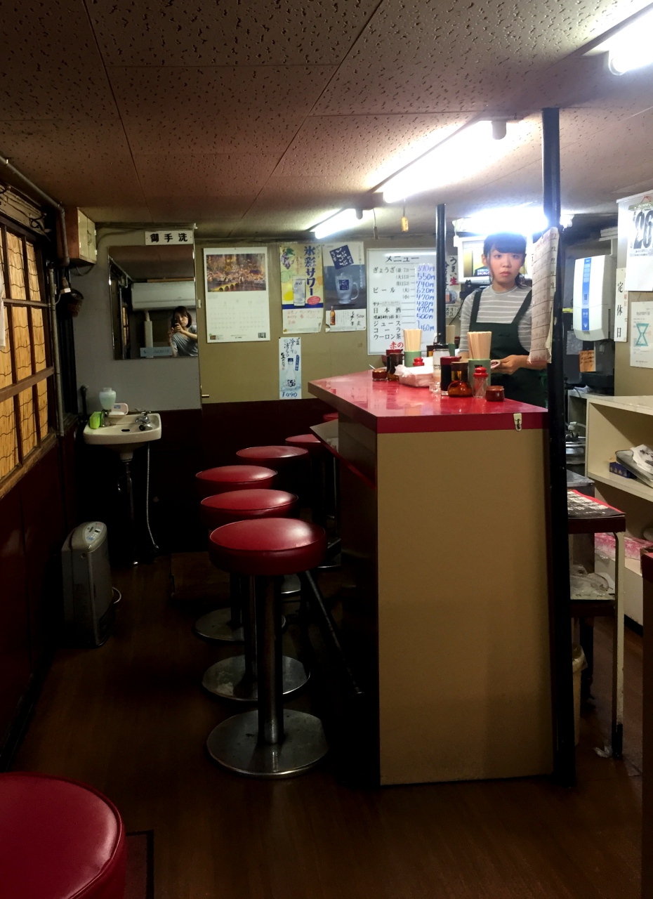 店外涂成一面红的老旧墙面,门口挂上了红色的暖帘,连招牌的霓虹灯也是红色,真是名符其实。傍晚五点多,老旧的店里约10个吧台座位已被零星占据,柜台也有等外带的客人,店员忙碌的在厨房跟外场穿梭。点了饺子及沙瓦,在仿佛回到了昭和时代的店内用餐,别有一番风味。