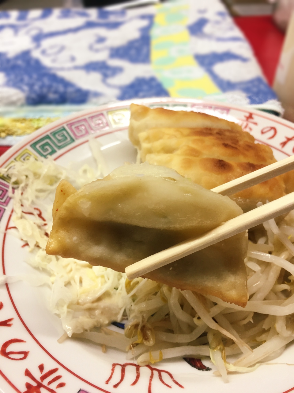 大粒的饺子配上切丝的高丽菜及水煮豆芽菜… …很另类的配法,也算是有吃到青菜(笑)。由于饺子真的很大粒而且皮比想像中厚很多,所以小食量的我一下就饱了。