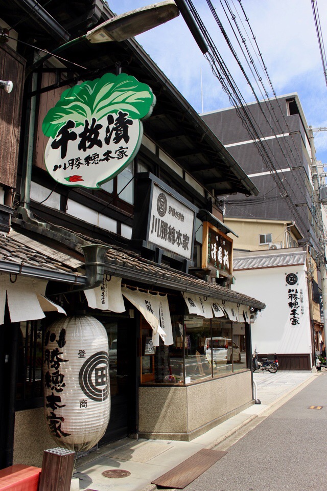离开「MARUKI制面包所」继续穿梭在附近的巷弄间,应该不难发现在大宫通这条路上,有一间外观典雅古朴却抢眼的日式建筑,挂着「千枚渍:川胜总本家」招牌的店家。喜欢京都腌渍物的朋友,这间店不容错过。