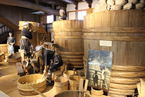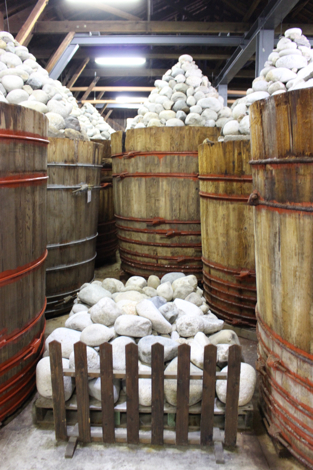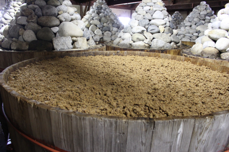 在 放置味噌静候发酵的巨大杉木桶上,堆叠了非常多的石块,目的是为了利用石块的重量来沥干水分。这样的做法算是冈崎的特殊传统。可别以为堆那些石块很简单, 因为每一块石头都很重,而堆叠也有特殊的方式,需要懂得堆叠技术的味噌酿造职人才能做到。而那些杉木桶与石块,据闻很多都已超过一个世纪。因为使用的木材 品质优良,每个木桶都能耐用一百年以上。
