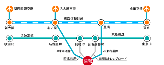 冈崎市位在爱知县的中央。从大阪乘坐新干线到冈崎市只需1.5小时,从东京需2小时就能到达。从中部国际机场乘坐当地铁道线路仅需50分钟。
