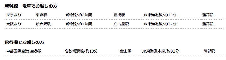 新干线:从新大阪出发约1 小时,转搭JR东海道线到浦郡